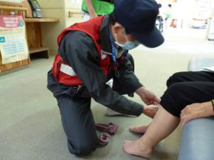さてこの日は、予定どおり福井大学エコーチームが南阿蘇村にてDVTのスクリーニングを行うため、各避難所にてそのサポートが我々のチームの任務で、検査前の問診と、結果により弾性ストッキングが処方された方へのサイズ計測と装着を行います。
