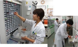 薬歴、問診票等をもとに処方箋内容の初期監査を経て調剤を行います。待ち時間短縮と同時に正確な調剤を支援するため自動調剤棚(PTP自動払い出し機)をはじめ薬袋発行機・自動錠剤分包機・全自動散薬分包機等の調剤機器を導入しています。またさらなる安全性を追求し、2013年PDA(携帯情報端末)を用いた調剤システムを導入予定です。